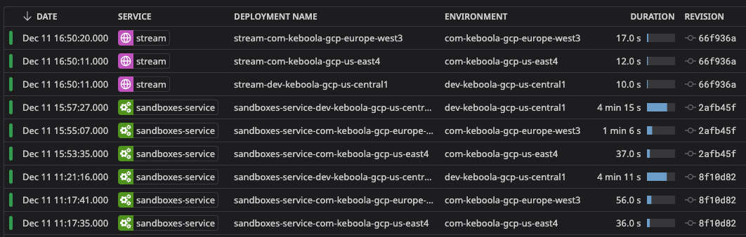 Since Keboola runs on all three major cloud providers—each adopted at different times—there are typically three different deployment methods for each service. For AWS, infrastructure is defined in CloudFormation; for Azure, it’s ARM templates; and for GCP, we use Terraform. Application manifests vary as well: on AWS and Azure, they are plain Kubernetes YAMLs, while on GCP, they are defined as Terraform resources (yes, we deploy Kubernetes manifests through Terraform). Each method is wrapped in Bash scripts and configured using a large YAML file containing all the necessary values (and secrets) for each deployment environment.
