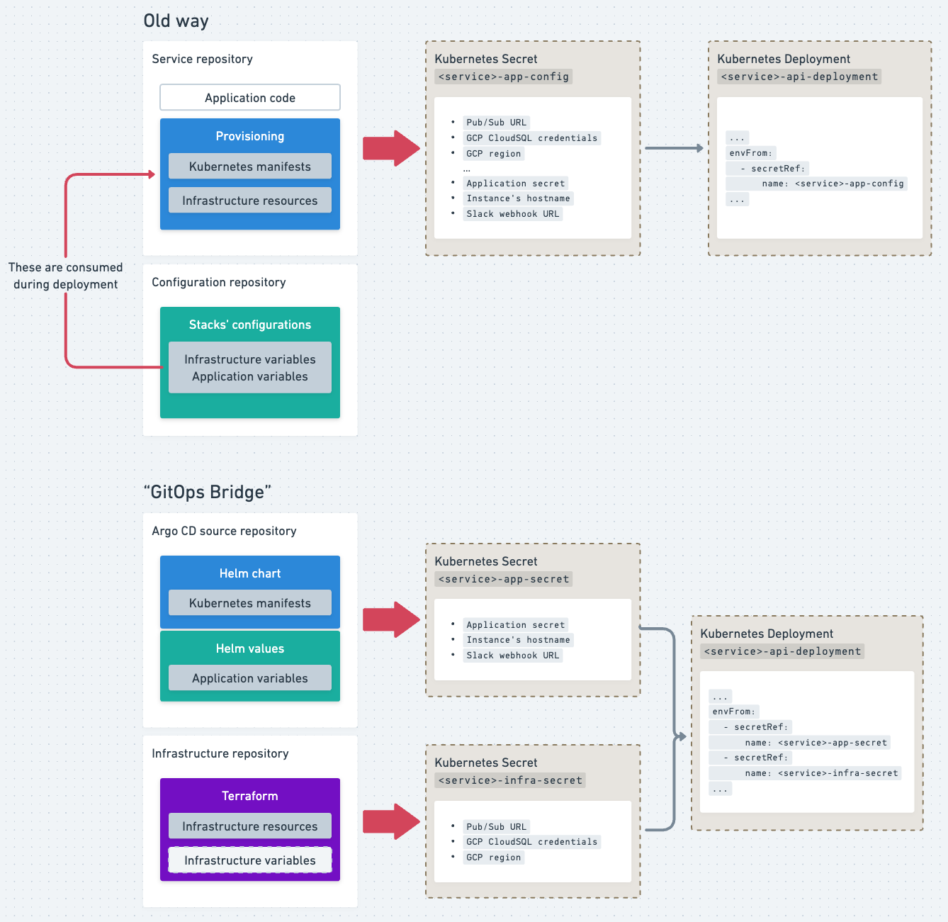 Similarly, we reworked how secrets are managed. Previously, all provisioning data—including application configurations, token secrets, and cloud resource identifiers (e.g., MySQL URLs, credentials, Pub/Sub links)—was packed into a single Kubernetes secret. In the new setup:
