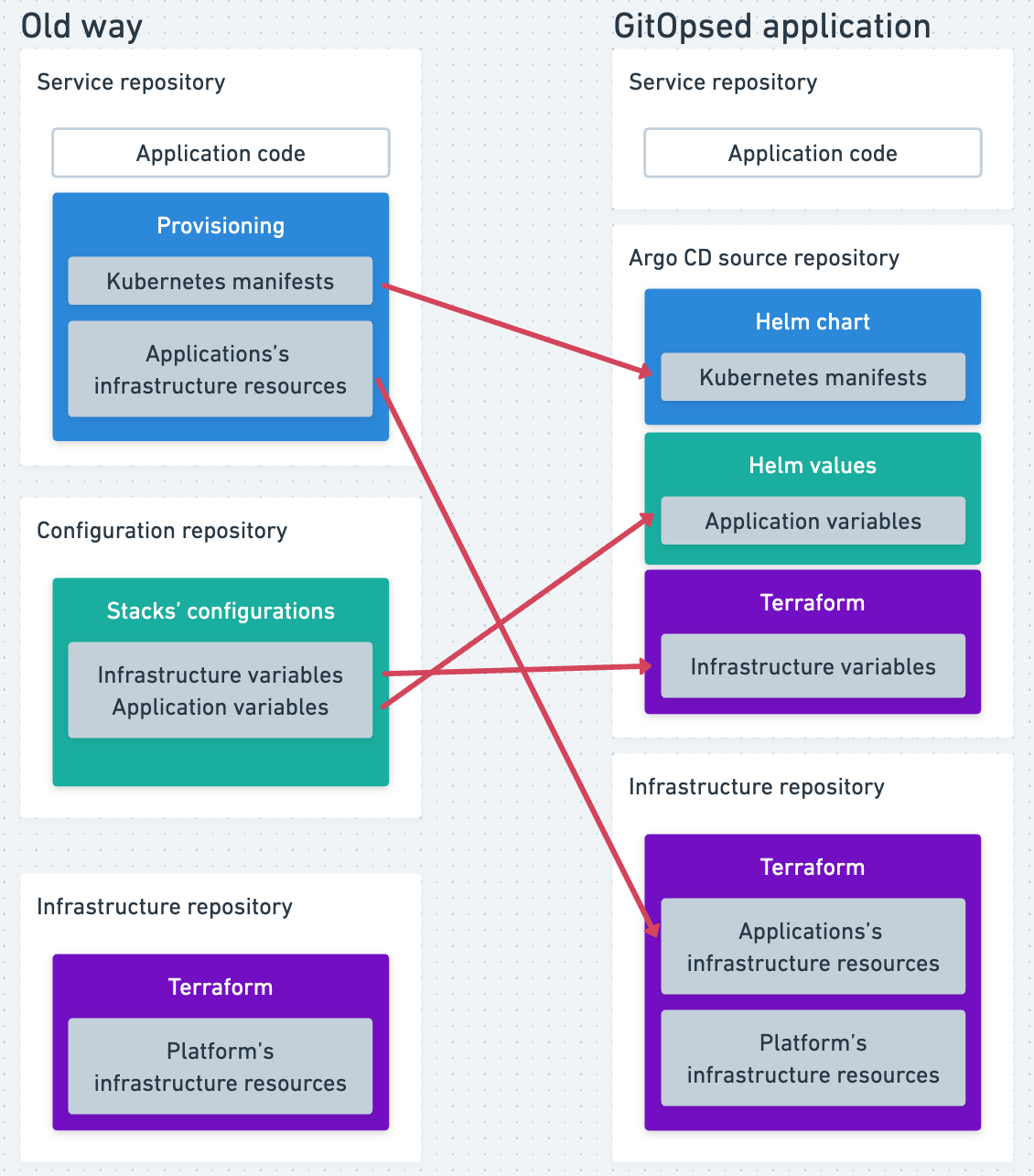 - Application Code: Remains in the original repositories.